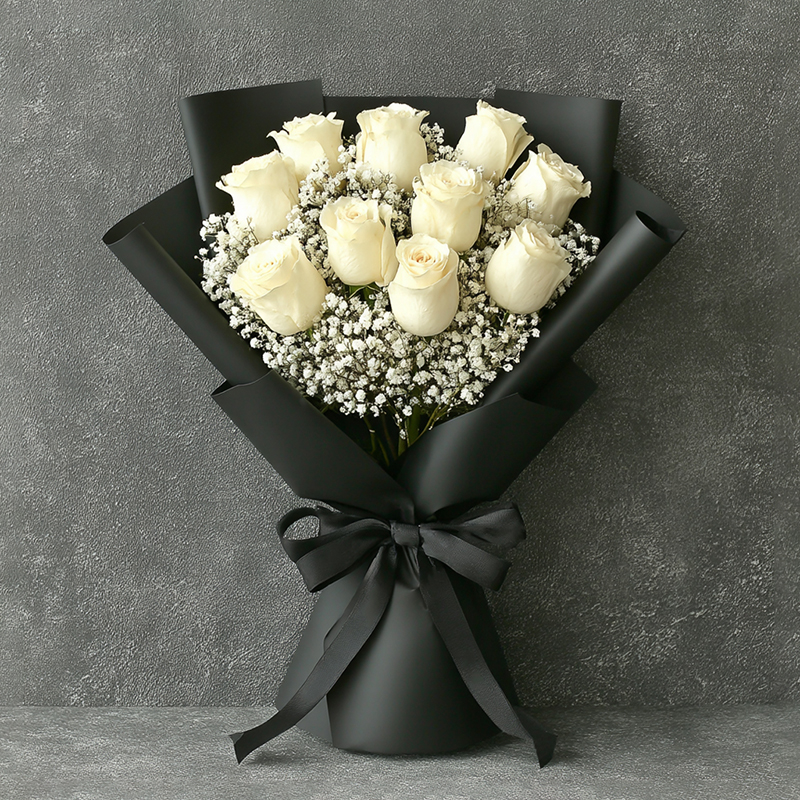 Baby’s breath scatters through the bouquet like fallen stars, softly breaking the silence.Black wrapping paper holds all the stillness, while a black ribbon ties it into a deep, elegant knot—as if to gather the hush of night and the purity of morning into one fragrant bundle.Gaze upon it, and you fall into a swirl of black and white,where even the wind carries a faint sweetness,telling a story of tranquility—a gentle footnote to a private kind of romance.
